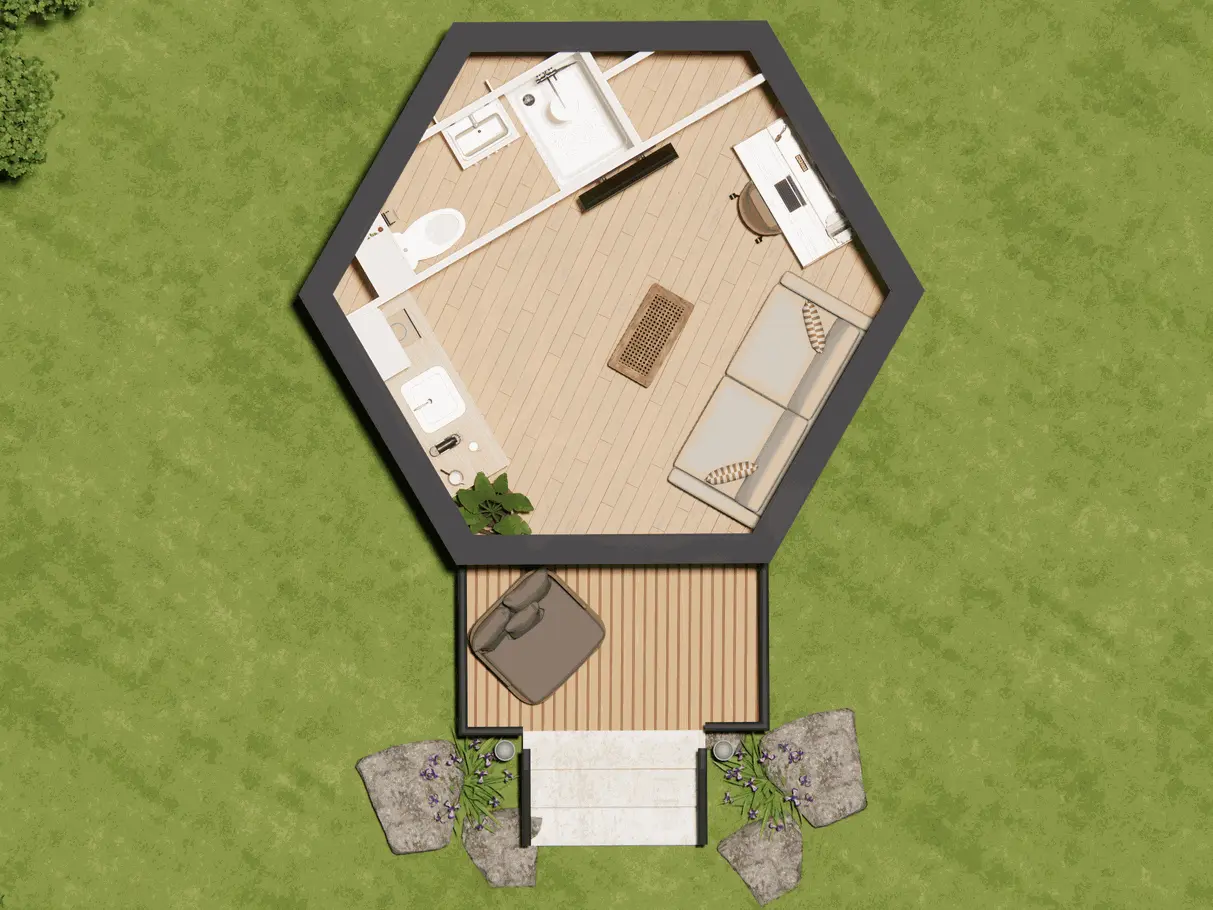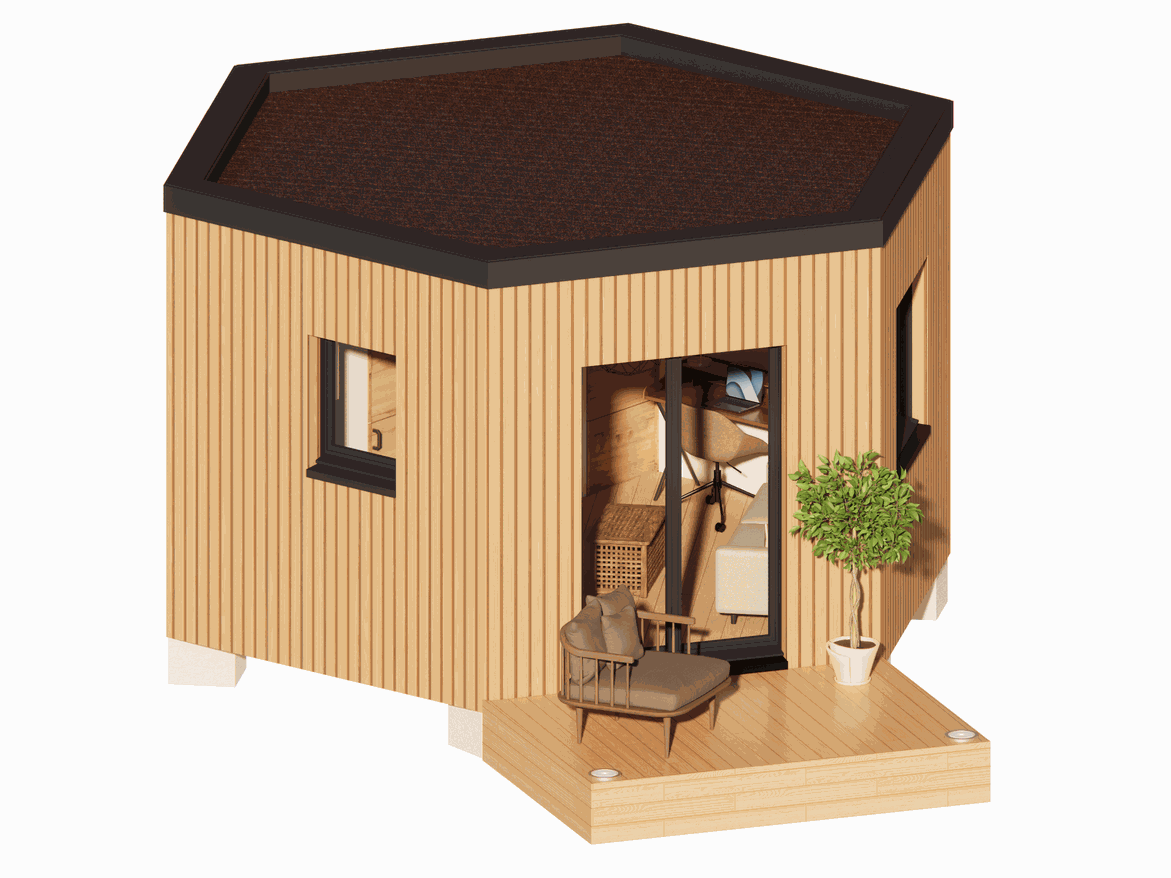 Avec sa surface optimisée de 15 m², c’est le modèle idéal pour vos projets de location saisonnière, de logement étudiant ou de chambre d’amis. Notre modèle s'adapte à tous vos besoins. Son design hexagonal unique, son installation rapide, sans permis de construire et ses aménagements sur mesure font du Maya 6 la référence incontournable de notre gamme.